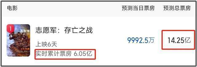 《志愿军:存亡之战》是今年国庆档目前的票房冠军,连续多日蝉联票房日冠,票房已经突破了6亿。今年国庆档目前总票房是15亿,《志愿军》的票房占据了总票房的五分之二。此外,该片预测总票房为14亿,是国庆档唯一一部预测总票房超10亿的影片。