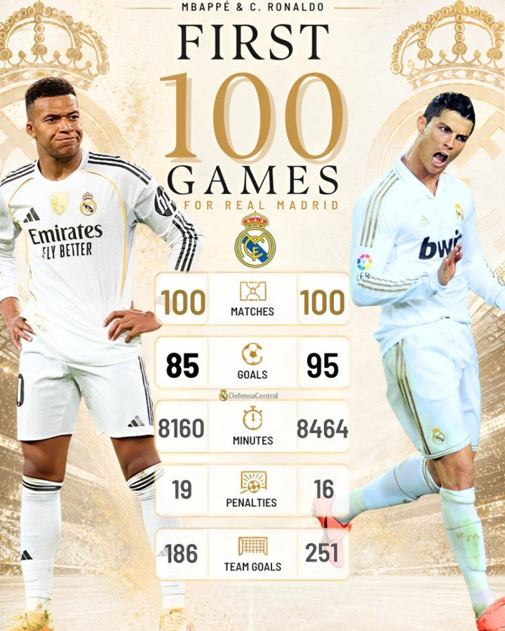 直播吧04月26日讯西甲第32轮,皇马1-1战平贝蒂斯,姆巴佩完成了代表皇马的百场里程碑,西班牙媒体晒图,对比了姆巴佩与C罗皇马百场时的数据。